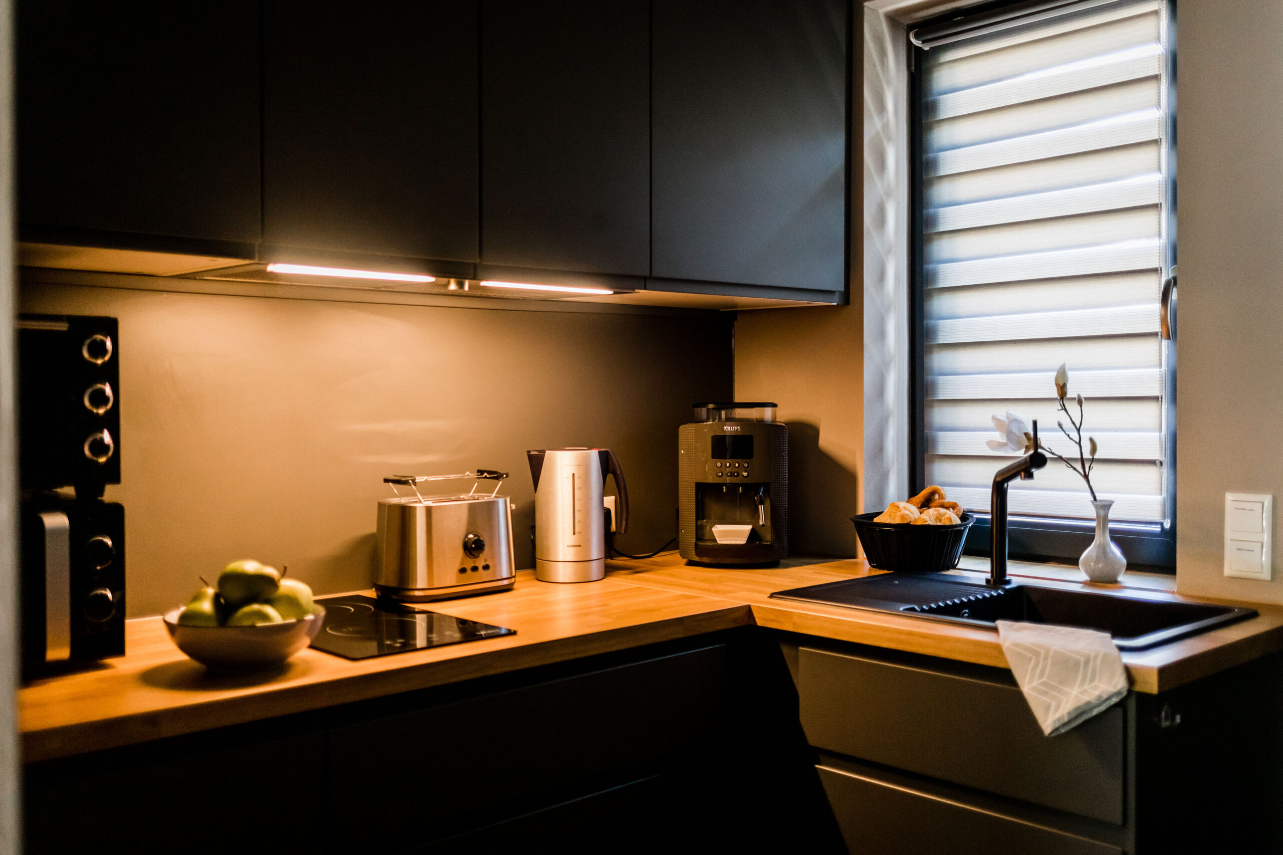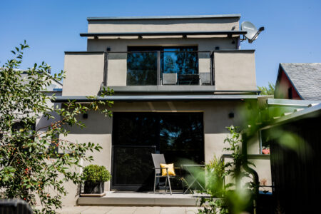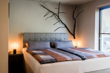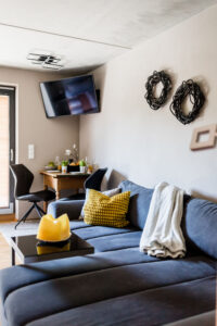 Unsere Wohnung im oberen Bereich hat eine Wohnfläche von ca. 35 m² und bietet Platz für 1 – 3 Personen oder 2 Erwachsene und 2 Kinder. Das gemütliche Wohnzimmer mit Eichenechtholzparkett, Schlafsofa und schwenkbarem Flachbild-TV lädt zum Verweilen ein. Die komplett ausgestattete Küche mit Kühlschrank inkl. Gefrierfach, kleinem Backofen, Herd, Mikrowelle, Wasserkocher, Toaster und Kaffeeautomaten lässt keine Wünsche offen. Das Ferienhaus verfügt über einem kombinierten Wohn- und Schlafbereich und ist mit einem großen Boxspringbett und dem Zugang zur Terrasse mit wunderbarem Ausblick auf die Natur. Die Betten sind bezogen und Handtücher sind vorhanden. Die sonnige Terrasse ist mit einer elektrischen Sonnenmarkise mit romantischem Licht und zusätzlich einer Sonnenliege ausgestattet. Das geräumige Badezimmer mit ebenerdiger Dusche, großem Spiegel, Fön, beleuchtetem Vergrößerungsspiegel und WC ausgestattet. Hier befindet sich auch ein Ankleideraum mit geräumigen Schrank und Teppichboden.
